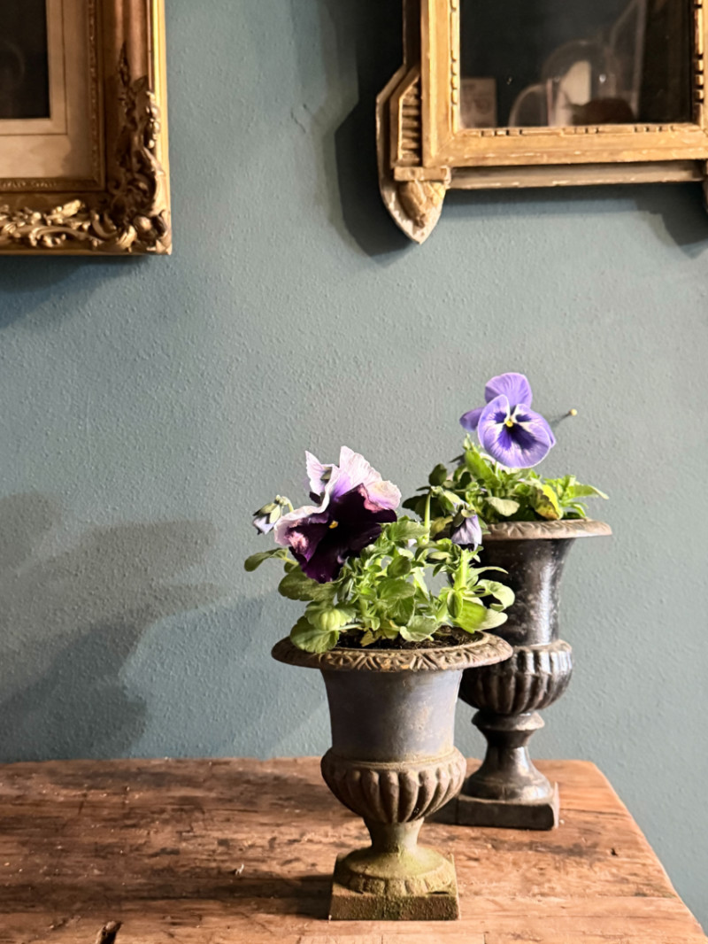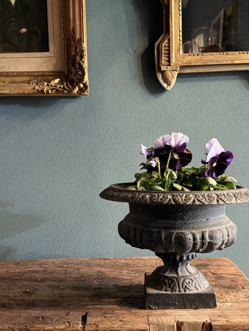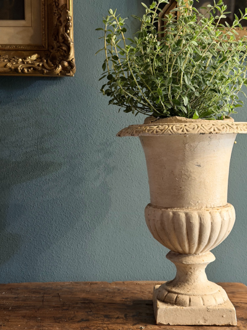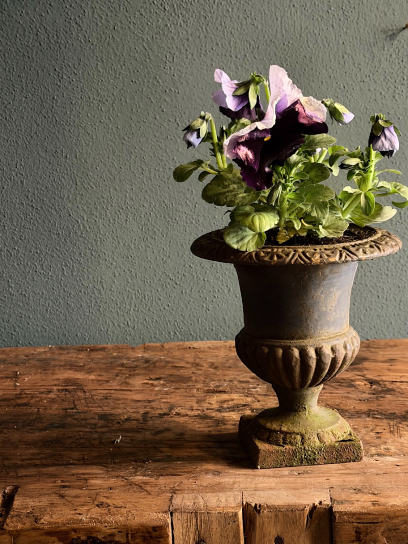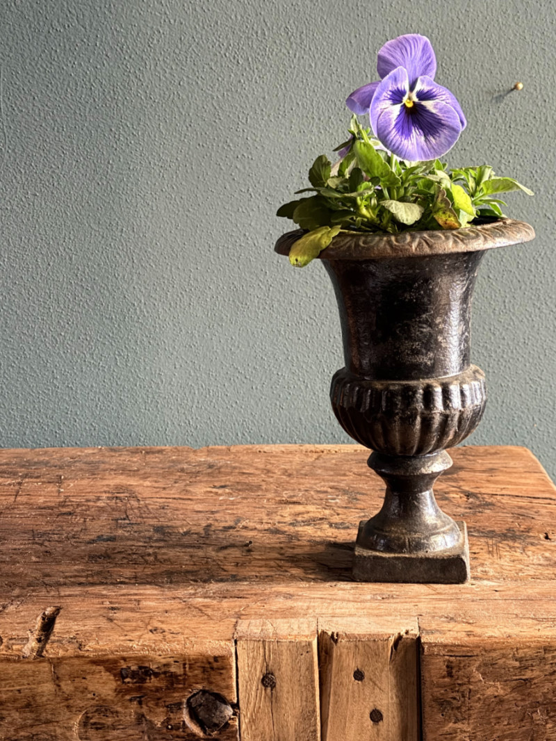 Questo vaso a calice in ghisa è un piccolo gioiello di artigianato classico, perfetto per chi ama i dettagli che raccontano una storia. Caratterizzato da una patina naturale con sfumature verderame e muschiate, questo pezzo sembra appena uscito da un giardino segreto d’altri tempi.