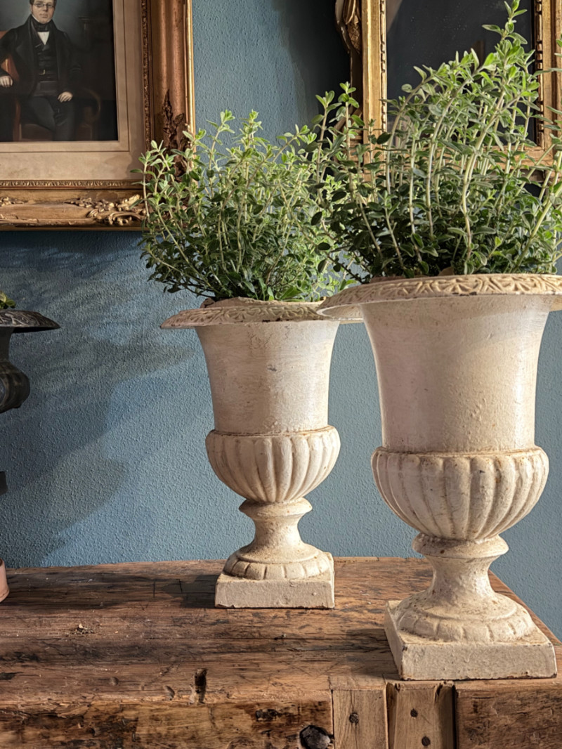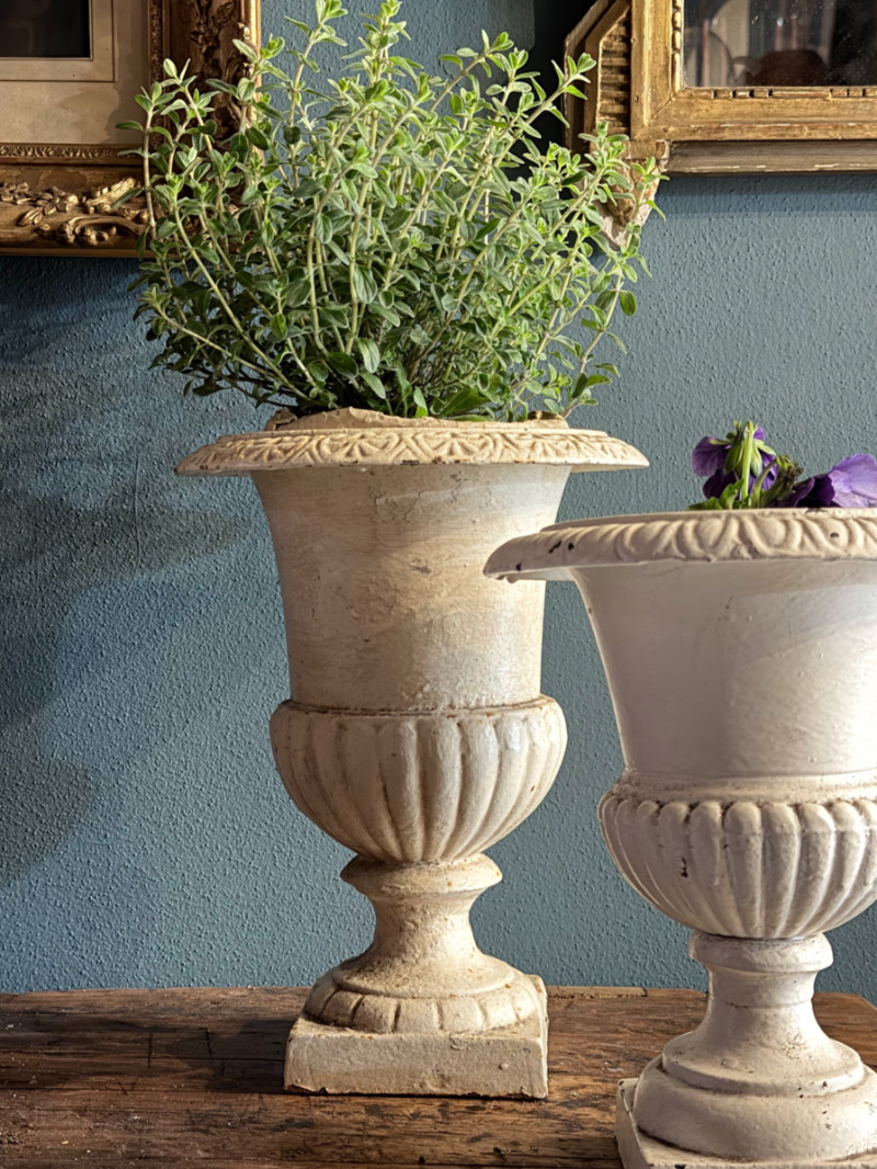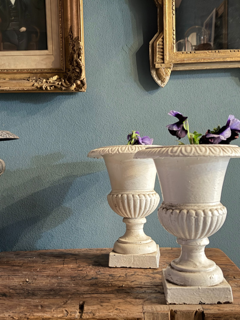 Questa raffinata coppia di vasi modello “Medici” rappresenta la scelta ideale per chi cerca il fascino dello stile classico in dimensioni più contenute. La finitura bianca luminosa, con una leggera patina anticata, li rende perfetti per ambienti che spaziano dal gusto Shabby Chic al classico senza tempo.