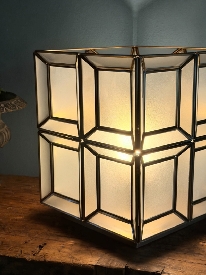 Aggiungi un tocco di eleganza architettonica ai tuoi spazi con questa raffinata lampada da tavolo. Caratterizzata da una struttura a lanterna cubica, questa lampada fonde il fascino del design vintage con la pulizia delle linee moderne, creando un punto luce scenografico e sofisticato.