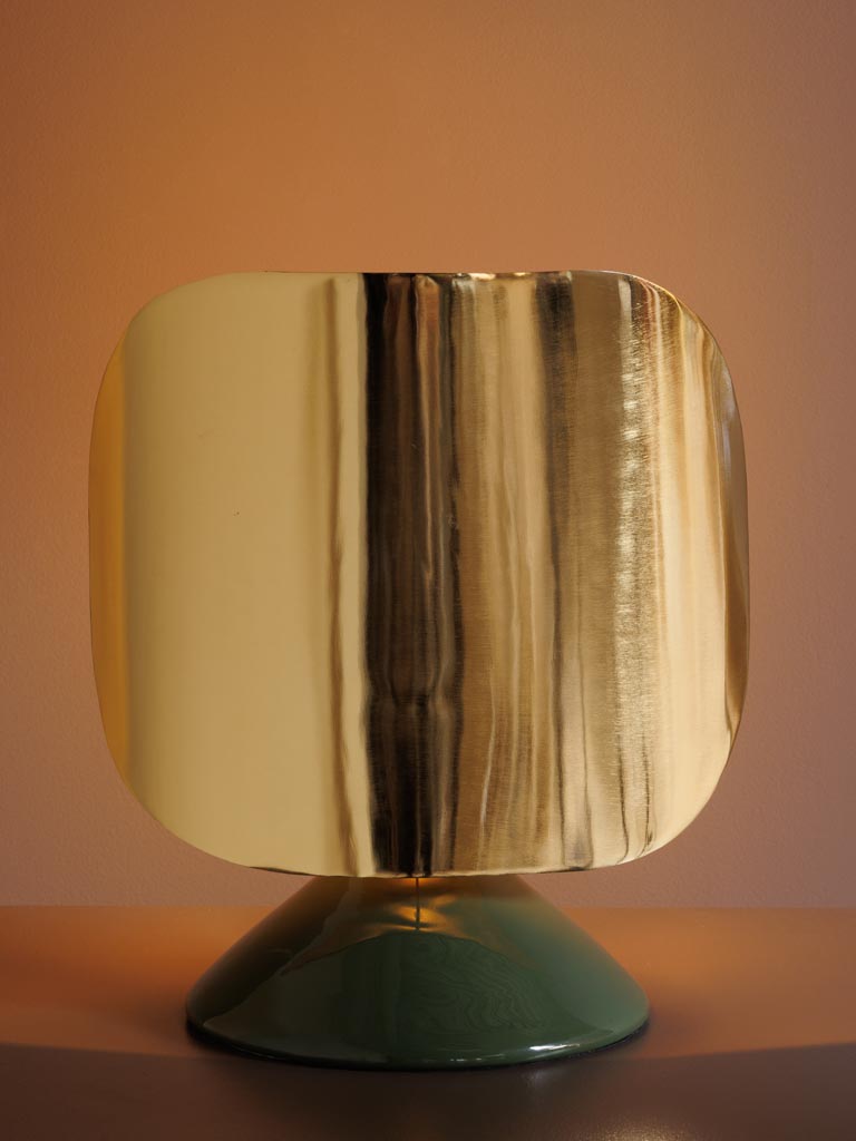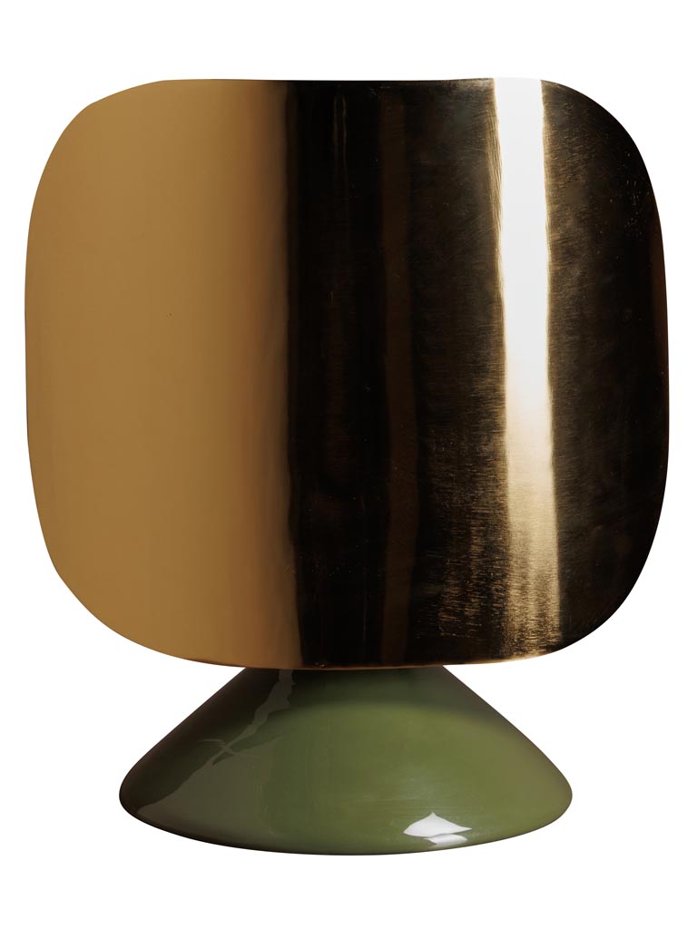 €110,00Lampada da tavolo in ferro, con ventola paralume oro, elegante contrasto verde della base.