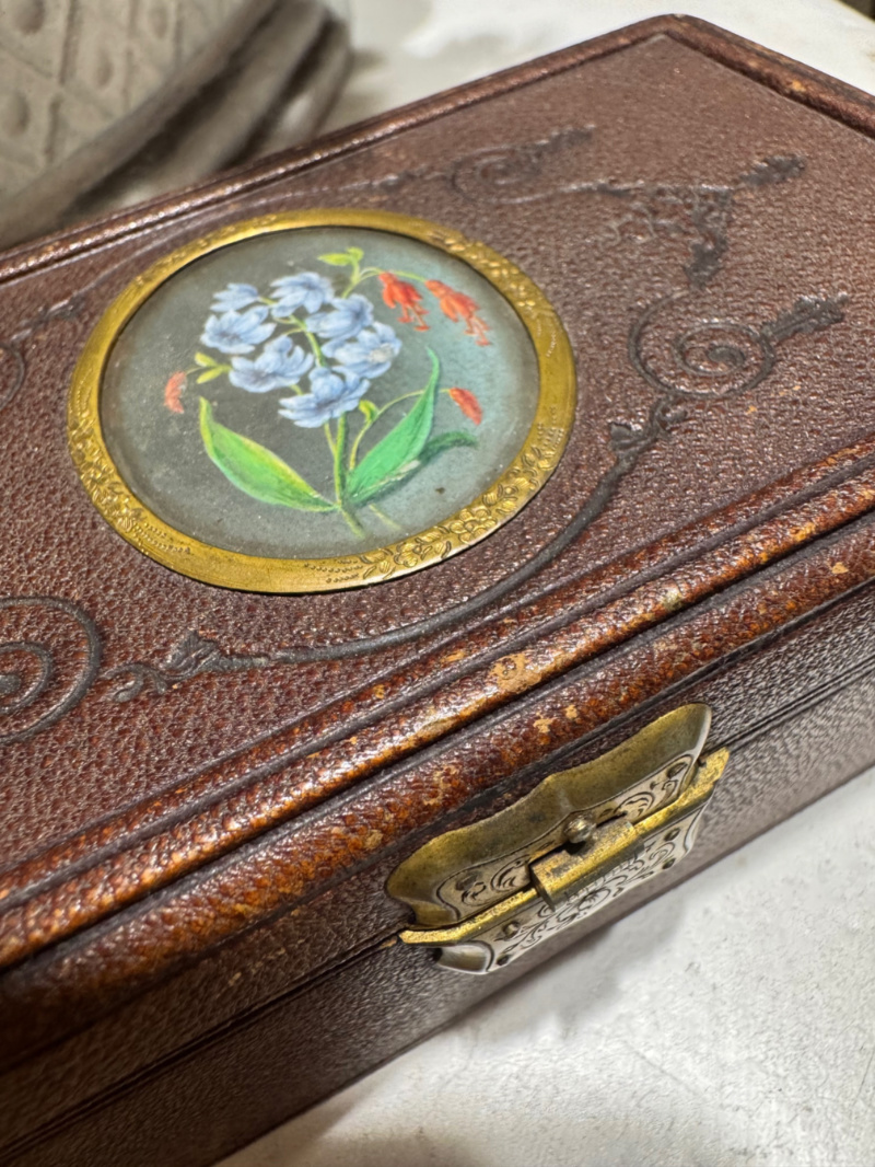 La scatola antica è caratterizzata da un rivestimento in pelle goffrata marrone.