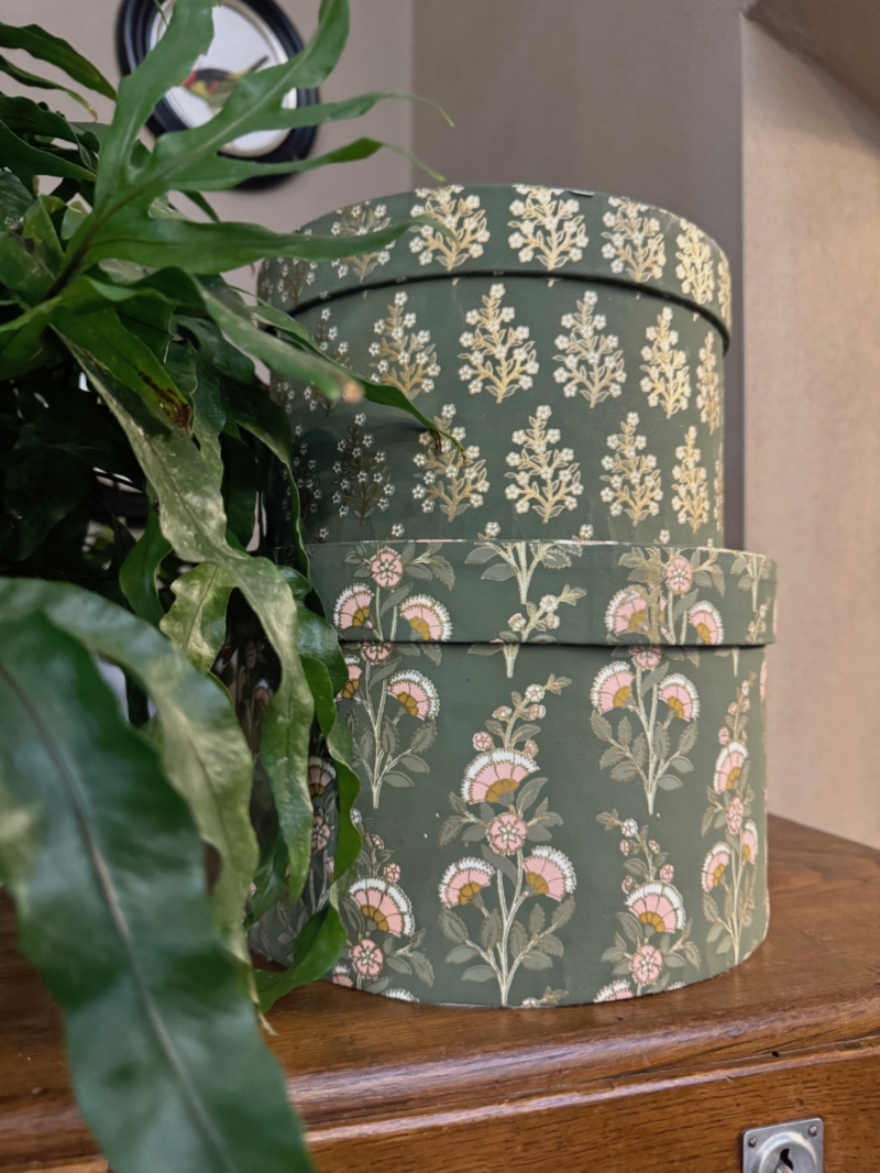 Scatole cappelliere rivestite in carta tessuto, scatole danesi in carta tessuto con decoro effetto tappezzeria, sempre seguendo le antiche tecniche che ebbero origine nell’VII sec.