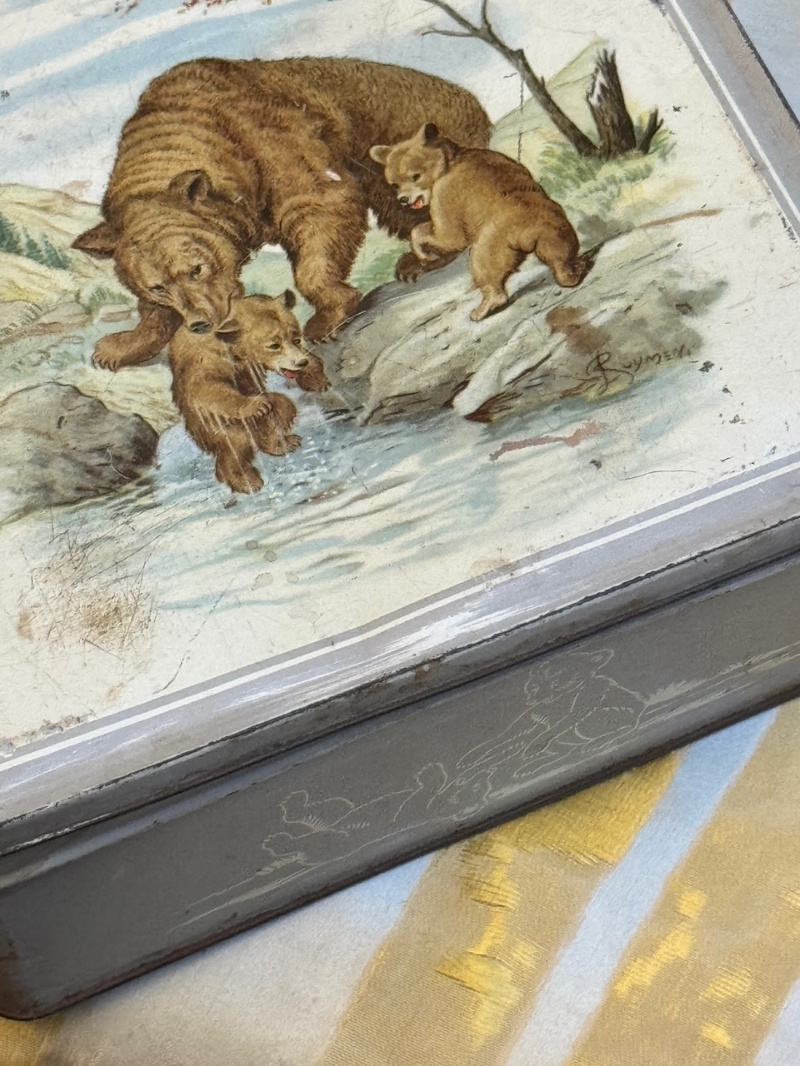 Una scatola vintage con una scena famigliare di simpatici orsetti. La scatola è in buone condizioni conservative, le cerniere di apertura funzionano molto bene.
