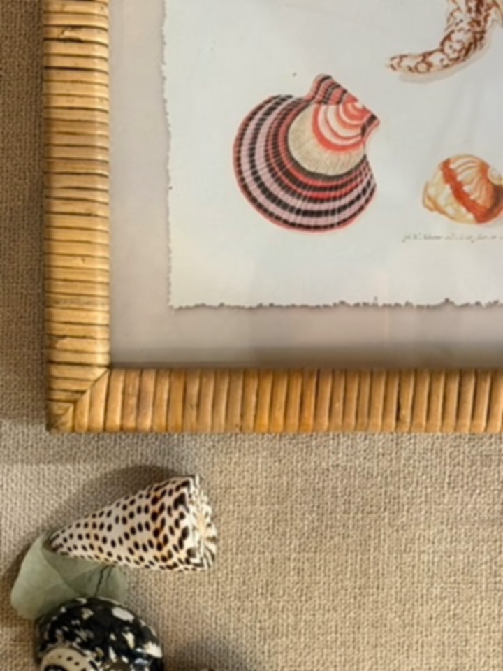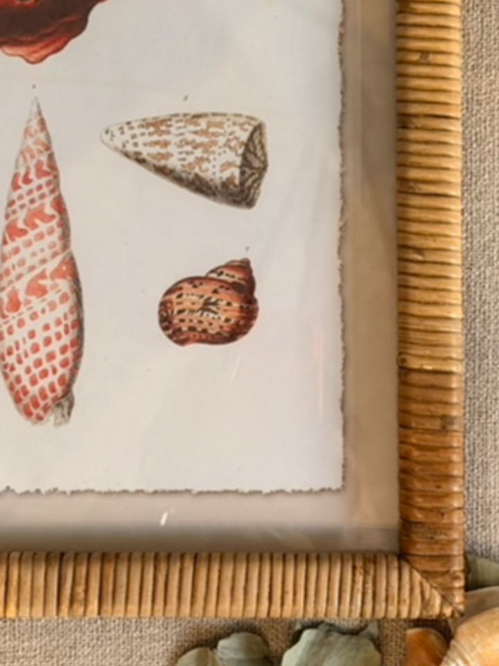 Il cuore di questo complemento d’arredo è la sua cornice in vero midollino (rattan). La trama intrecciata a mano scalda l’ambiente, offrendo una texture organica che si sposa divinamente con materiali nobili come il lino e il legno grezzo. La stampa, con i suoi bordi frastagliati a mano, fluttua su un fondo neutro, creando un effetto profondità tipico delle gallerie d’arte più ricercate. Soggetto Naturalistico: Illustrazione scientifica vintage con dettagli di conchiglie nei toni del terracotta, bordeaux e crema.Materiali Sostenibili: Cornice in rattan naturale, un materiale eco-friendly e di grande tendenza nel design d’interni Versatilità: Ideale come pezzo unico in un ingresso o come elemento centrale di una gallery wall a tema naturalistico.